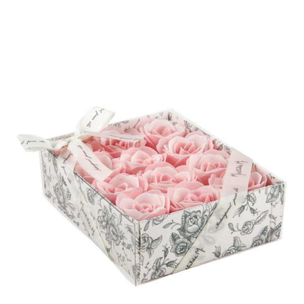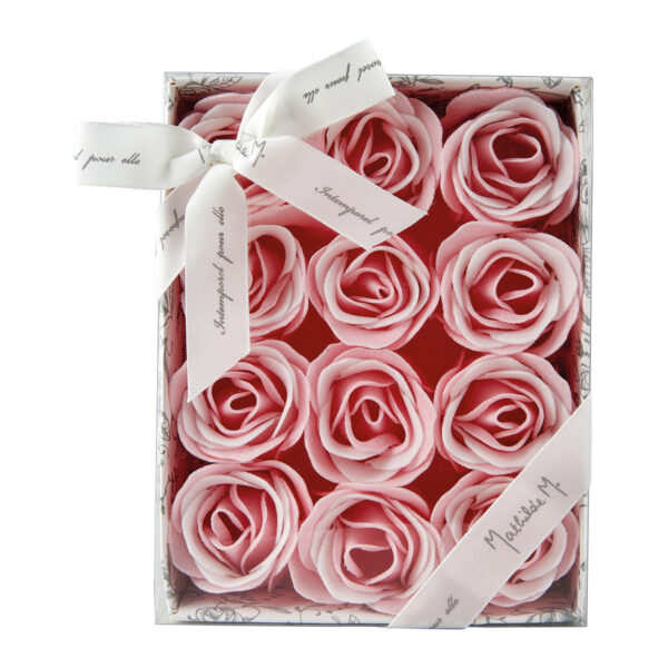 Caja de 12 rosas en pétalos de jabón rosa y blanco – Perfume de rosas