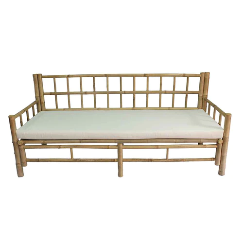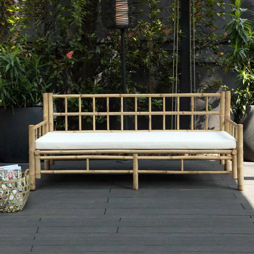 Este banco de bambú de 3 plazas, elaborado artesanalmente, agrada por su naturalidad, su estilo exótico y la gráfica de su respaldo cuadrado.